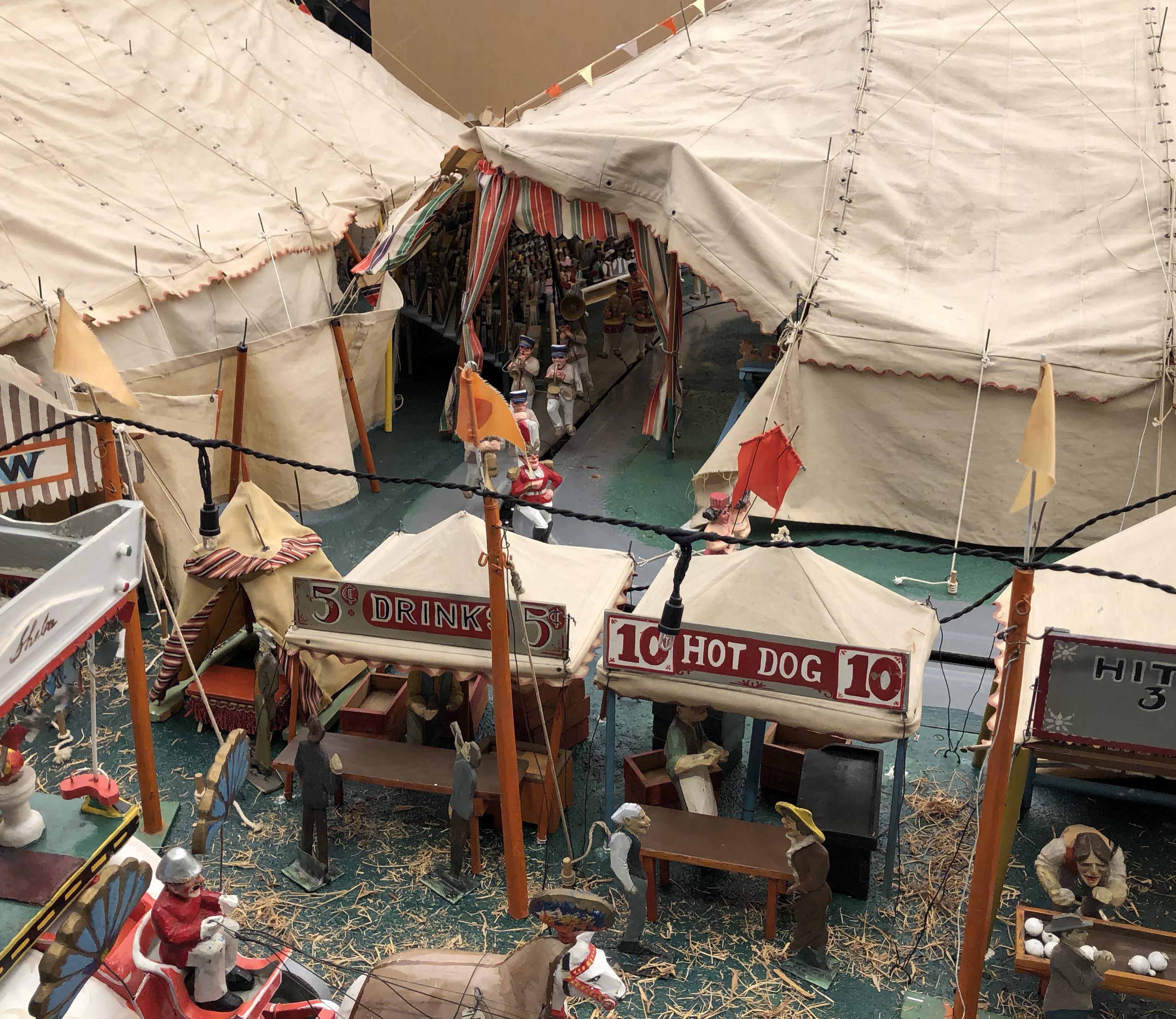 Above: Museum exhibits supervisor Caroline Mitchell Carrico (right) prepares to lead the sneak-peek tour. The new faux limestone facade of the mansion entrance invites guests into a storyline that takes patrons through the mansion’s history. Clarence Saunders dream to build a “self-sufficient” estate that Memphis could be proud of began years earlier with the founding of his Country Store and later of his iconic Piggly Wiggly stores.The re-opened mansion includes various Memphis artifacts and historical narratives, including this stained-glass window salvaged from the old T.H. Hayes Funeral Home that was demolished in 2010.A re-imagined Cossitt Library Gallery recreates the first museum in Memphis.The history of the mansion itself figures prominently in the new storyline. “After all,” says Caroline Carrico, “the mansion alone is one of Memphis’s greatest artifacts.” Caroline Mitchell Carrico, Supervisor of Exhibits and Graphic Services. Caroline looks at the renovated mansion almost like her third child; her first child was born five years ago, just before the efforts, and her second during the renovation. One of Caroline’s personal favorites is the newly-renovated Grand Lobby, which features the historic murals of Burton Callicott (top), which hung in this space from 1934 to 1995. The murals, painted on thick canvas, were removed in ’95 for extensive conservation, and moved again in 2016 during the mansion renovations. About the lobby, Caroline says, “we are incredibly excited to have visitors be able to walk up the grand staircase to access the second floor of the mansion.”Once upstairs, visitors will find one of the treasured artifacts that they have been most anxious to see: Clyde Parke’s miniature circus. On this day, December 4, the fully-animated circus was not yet in motion, and workers were still installing the plexiglass that will protect the hand-carved wooden figures, hand-stitched tents and machinations from little hands. When Clyde Parke finally donated his circus to the museum in 1970, he took four months to disassemble the circus in his attic and reassemble it at the Pink Palace. Laurel Albrecht (conservator) and Tim Giles (master builder) repeated the feat by disassembling it from its former location – and cleaning every last micro-inch of it – and reassembling it in its new room upstairs and adjacent to the Grand Lobby.Last view of the Callicott murals in the Grand Lobby.