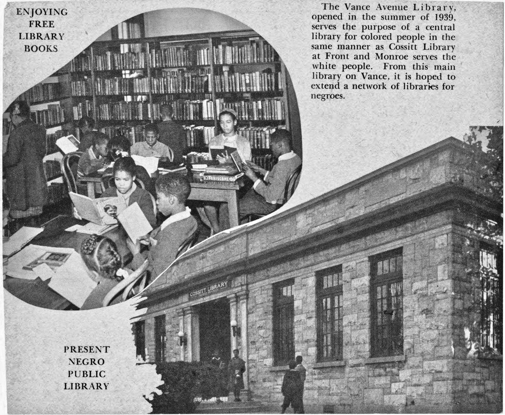 Known as the “Negro Public Library,” a city pamphlet said of the library at 531 Vance Avenue, just west of South Lauderdale Street: “The Vance Avenue Library, opened in the summer of 1939, serves the purpose of a central library for colored people in the same manner as Cossitt Library at Front and Monroe serves the white people. From this main library on Vance, it is hoped to extend a network of libraries for negroes.”