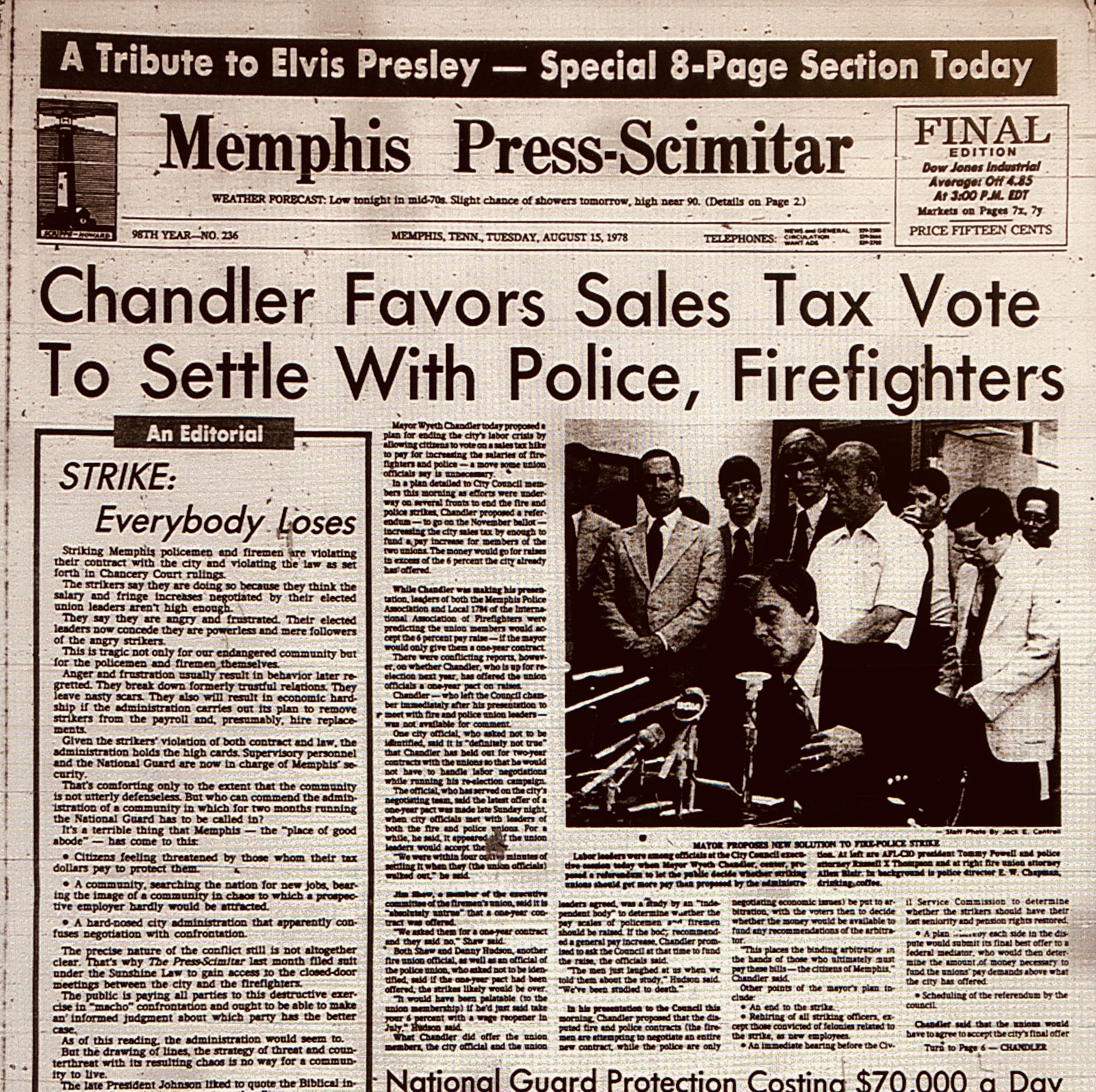 Mayor Chandler Tries To Settle Strike, and Elvis Fans, Camping Out At The One-Year Anniversary Of The King’s Death, Stay Put During A “Massive Blackout”
